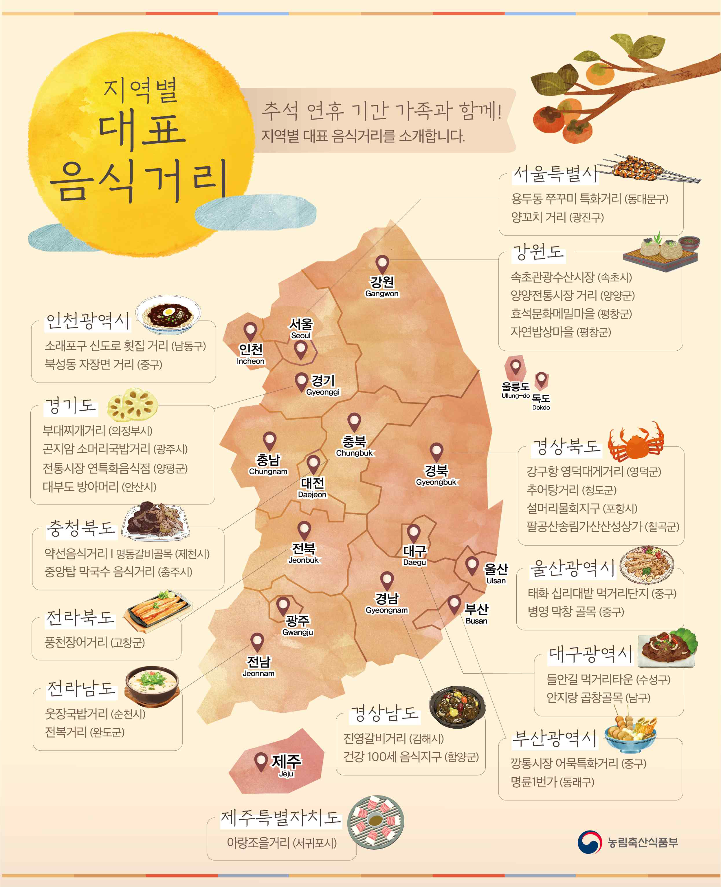 농림축산식품부는 지자체와 함께 추석 연휴 기간(2019.9.12~15)에 귀성객과 각 지역을 방문하는 관광객이 찾아 가서 즐길 수 있는 전국의 특색있는 음식거리를 발표하였습니다.
