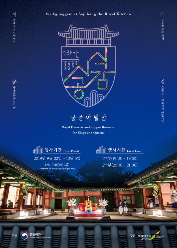 문화재청 궁능유적본부가 주최하고, 한국문화재재단이 주관하는 2019년 하반기 <수라간 시식공감>이 오는 22일부터 10월 5일까지 경복궁 소주방에서 1일 2회씩 총 24회 진행된다고 밝혔습니다.