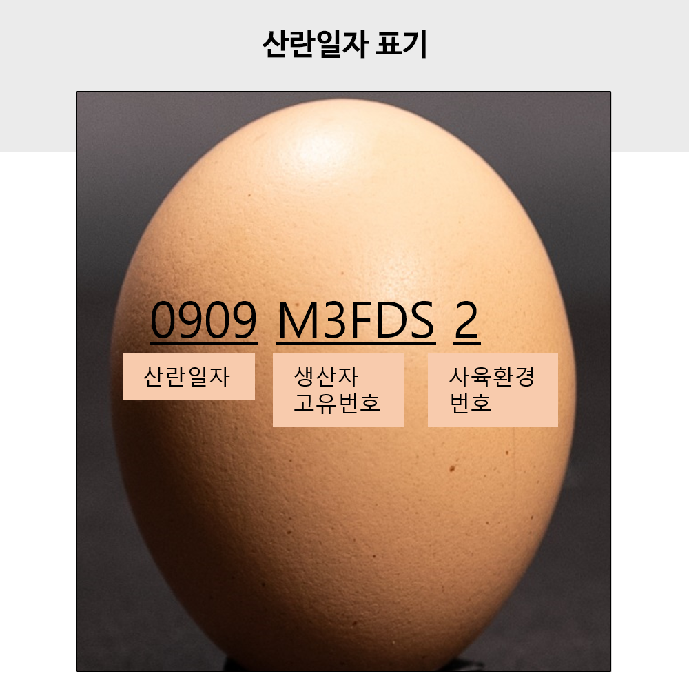 9월 9일에 낳은 달걀의 산란일은 0909로 나타냅니다. 생산자 고유번호는 가축사육업 허가 시 부여되는 농장별 고유번호입니다. 식품의약품안전처 누리집 ‘식품안전나라(www.foodsafetykorea.go.kr)’에서도 농가 이름과 주소 등을 확인할 수 있습니다. 사육환경번호*는 달걀을 생산하는 닭의 사육 환경에 따라 1∼4까지 번호로 표시합니다.