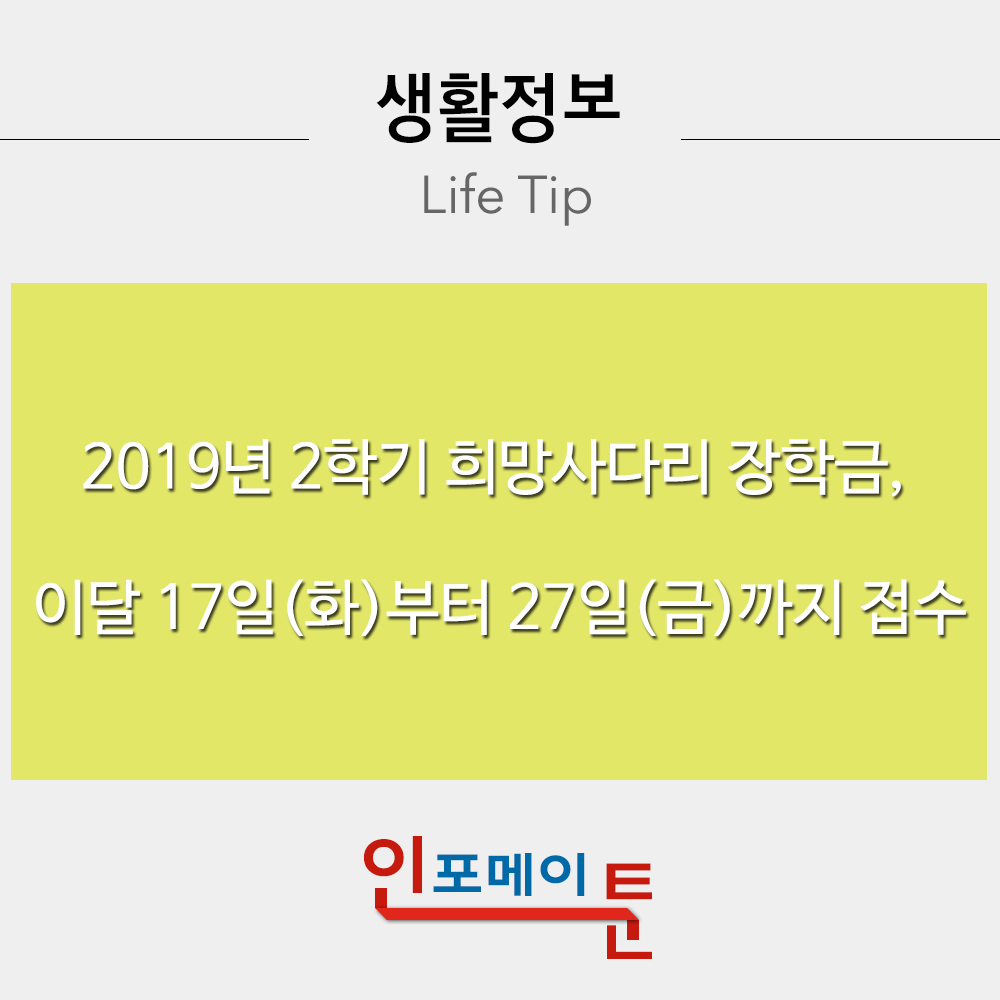 2019학년도 2학기 희망사다리 장학금 신청을 2019년 9월 17일(화)부터 27일(금)까지 한국장학재단 누리집(www.kosaf.go.kr)에서 접수한다고 밝혔습니다.