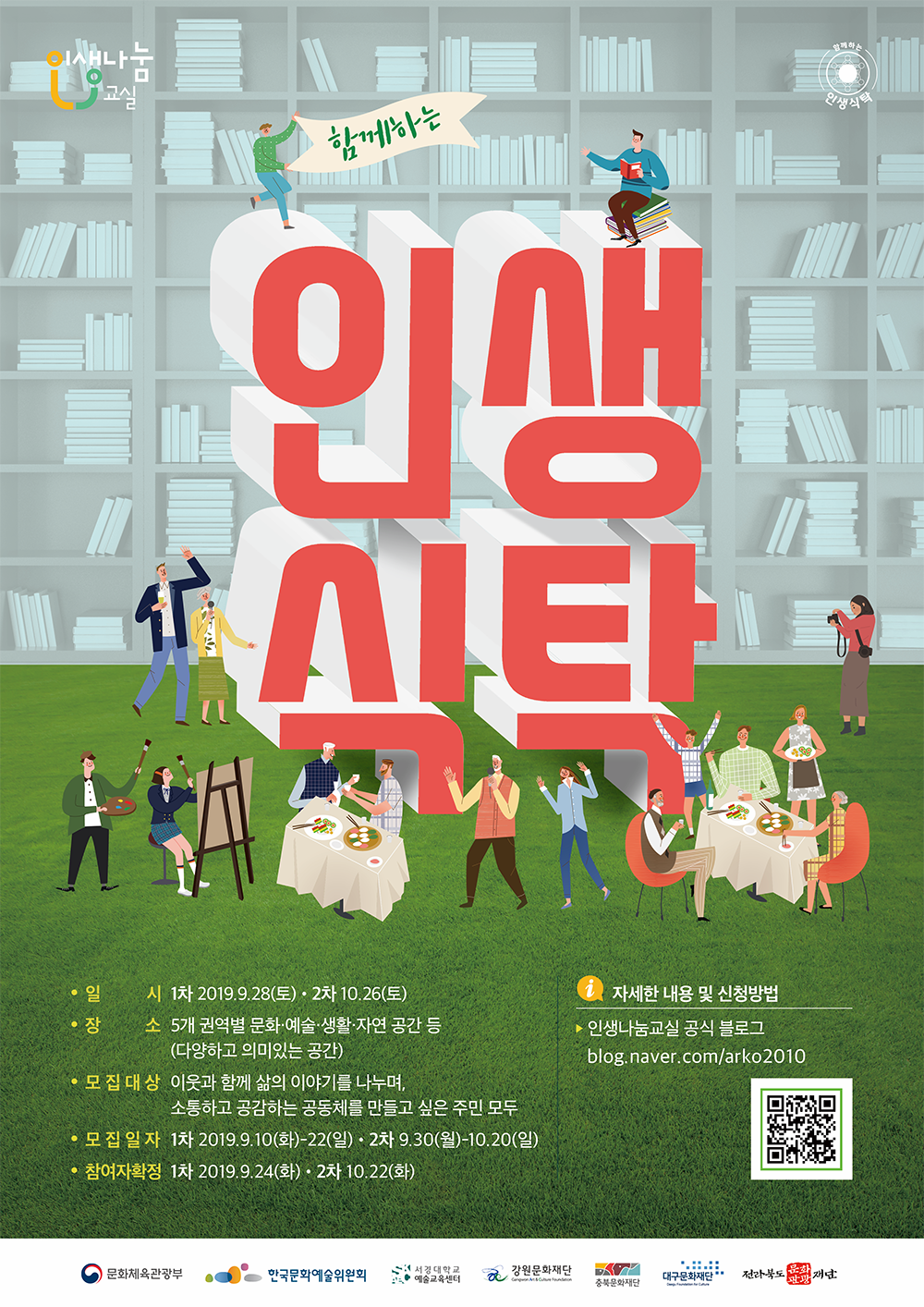 문화체육관광부(이하 문체부)는 한국문화예술위원회(이하 예술위)와 함께 전국 5개 권역에서 9월, 10월의 넷째 주 토요일에 인생나눔교실 ‘함께하는 인생식탁(이하 인생식탁)’ 행사를 개최한다고 밝혔습니다.