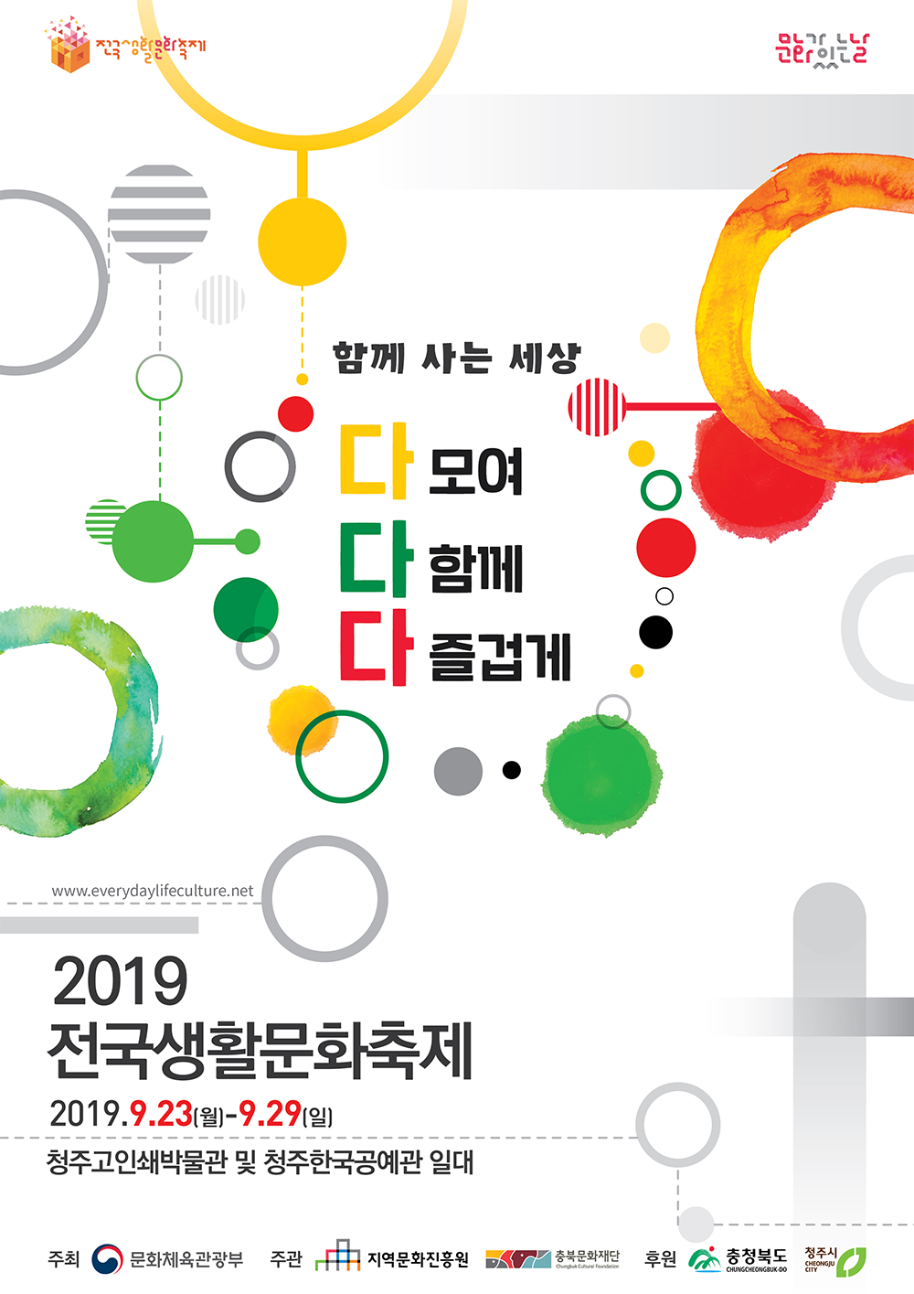 문화체육관광부(이하 문체부)가 주최하고 지역문화진흥원과 충북문화재단이 공동으로 주관하는 ‘2019 전국생활문화축제’가 2019년 9월 23일(월)부터 29일(일)까지 충북 청주고인쇄박물관과 청주한국공예관 일대에서 열립니다.