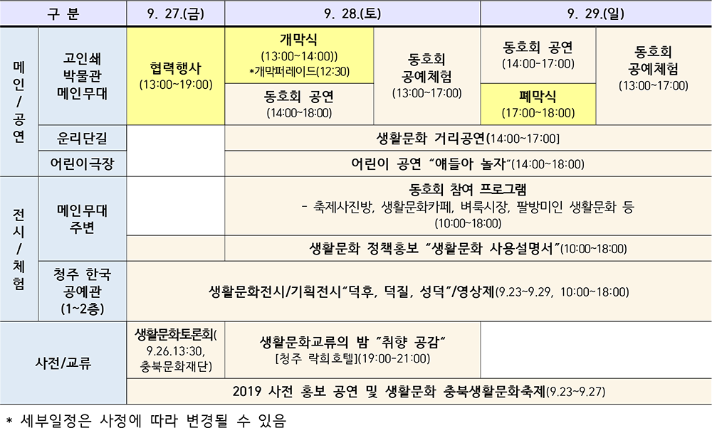 9월 27일(금)부터는 본격적인 축제 분위기를 더해줄 다양한 프로그램들이 이어집니다. 9월 27일(금), ‘다 모이는 날’에는 오후 1시부터 저녁 7시까지 ‘충북생활문화축제’가 열립니다. 충북권에서 활동하고 있는 생활문화동호회 100여 개가 모여 다양하고 특색 있는 충북지역 생활문화를 집중적으로 소개합니다.
