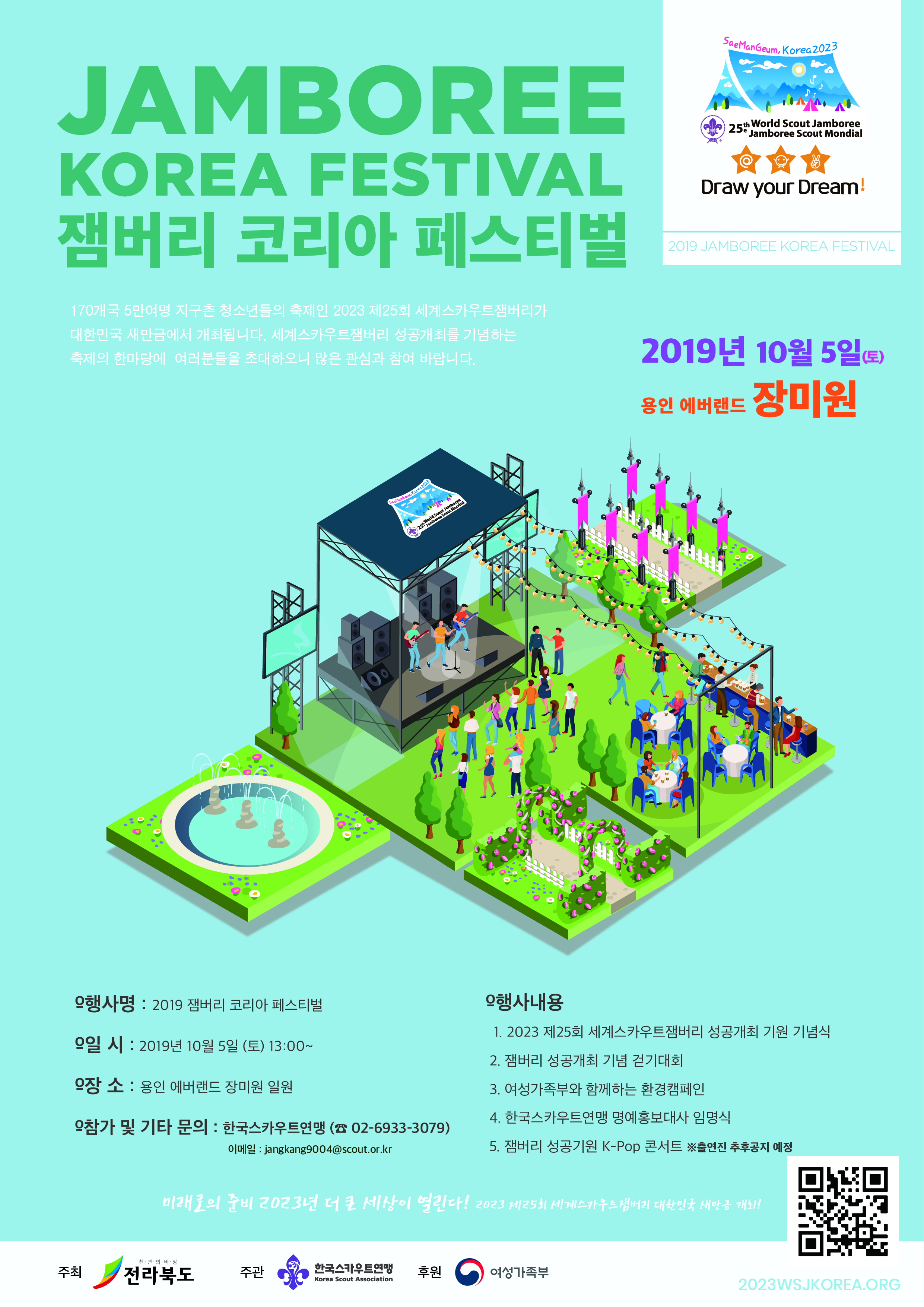 ‘2023 새만금 제25회 세계스카우트잼버리(이하 ‘2023 세계잼버리’)’의 성공적인 개최를 기원하는 ‘2019 잼버리 코리아 페스티벌(축제)’이 오는 2019년 10월 5일(토) 용인 에버랜드에서 개최됩니다.