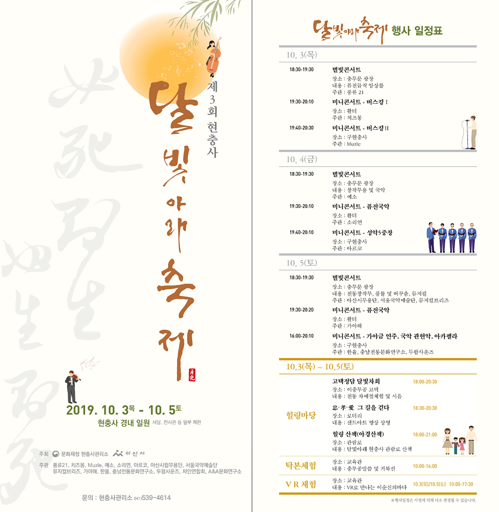 문화재청 현충사관리소와 충남 아산시는 오는 2019년 10월 3일부터 5일까지 문화예술 행사로 <제3회 현충사 달빛 아래 축제>를 개최한다고 밝혔습니다.