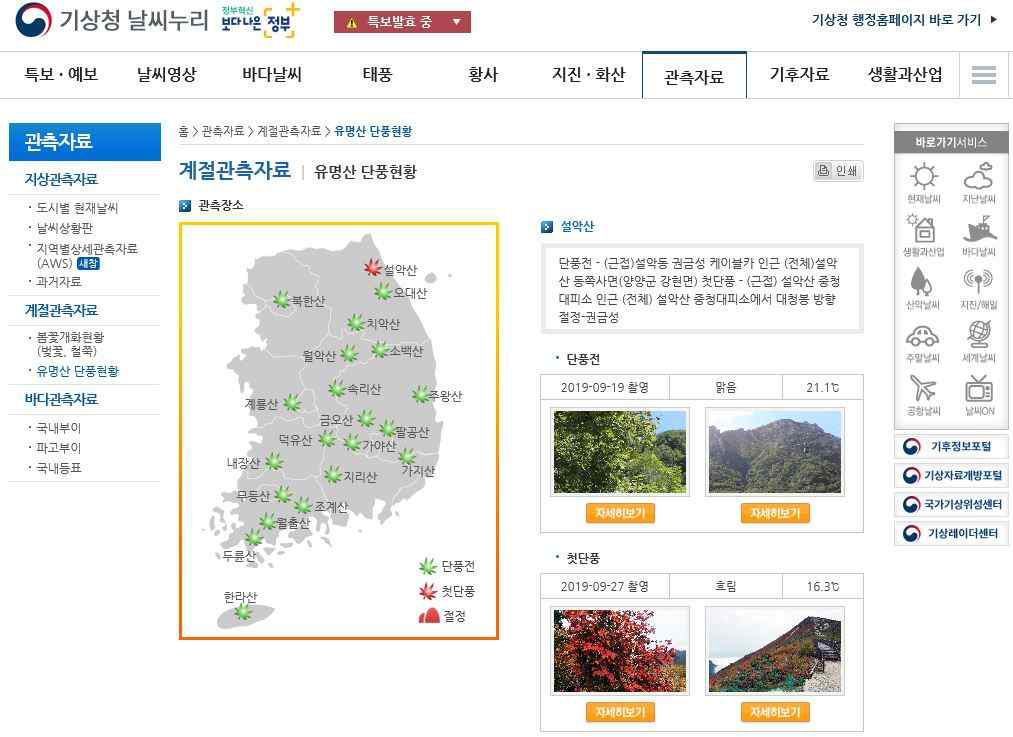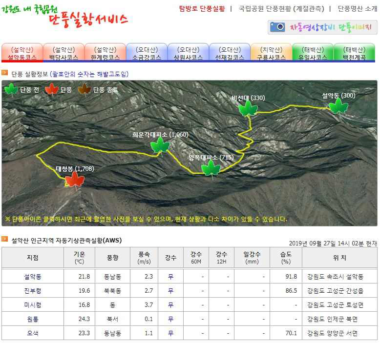 기상청에서는 전국 국립공원의 단풍정보를 날씨누리 (www.weather.go.kr)를 통해 제공하며, 설악산 등 강원도 내 국립공원 탐방로 9개에 대한 단풍실황을 강원지방기상청 누리집(gangwon.kma.go.kr) 에서 확인할 수 있습니다.