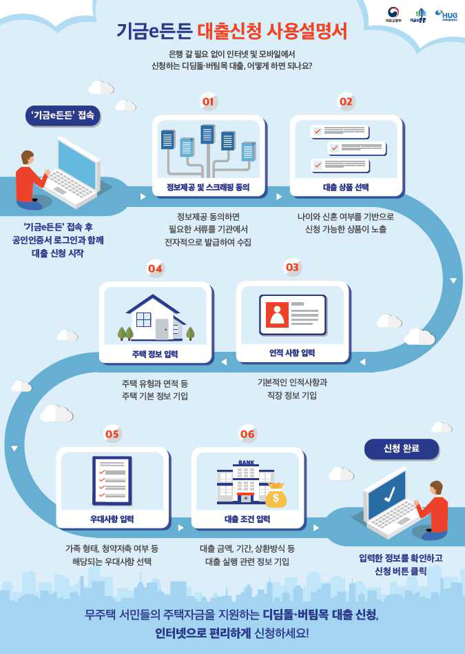 신청자는 본인과 배우자의 전자 공인인증서를 준비하여 인터넷 ‘기금e든든(enhuf.molit.go.kr)’에 접속하거나, 모바일 앱을 내려 받아 화면에 나오는 순서대로 정보를 입력하면 됩니다. 공인인증서가 없거나 새로 발급받기 어려운 경우 가까운 은행 영업점을 방문하여 대출을 신청할 수 있습니다.