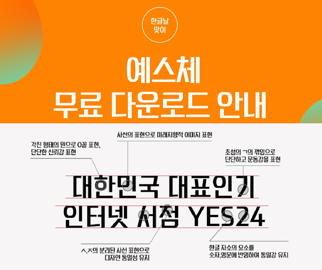 대한민국 대표 서점 예스24가 창립 20주년을 맞아 예스24만의 서체를 개발했습니다. 또한 이 서체는 10월 9일 한글날을 맞아 무료로 배포한다고 밝혔습니다.
