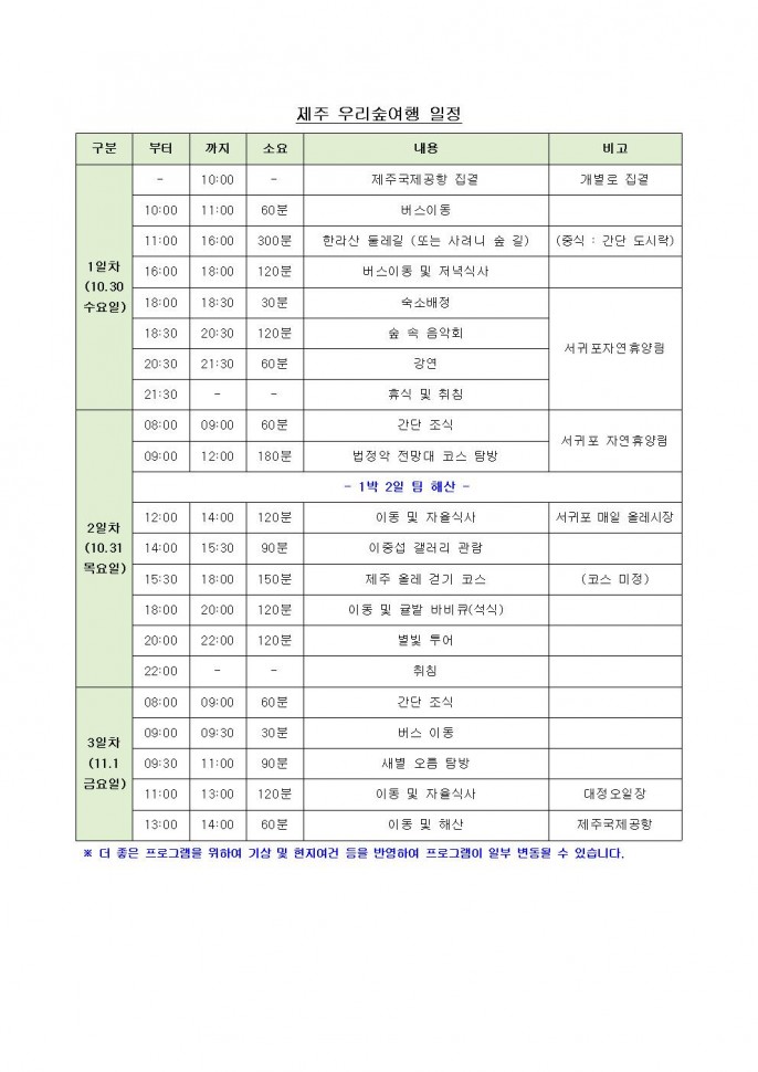 이번 제주 숲여행은 2019년 10월 30일부터 11월 1일까지로 1박 2일 일정과 2박 3일 일정으로 나누어 진행합니다.