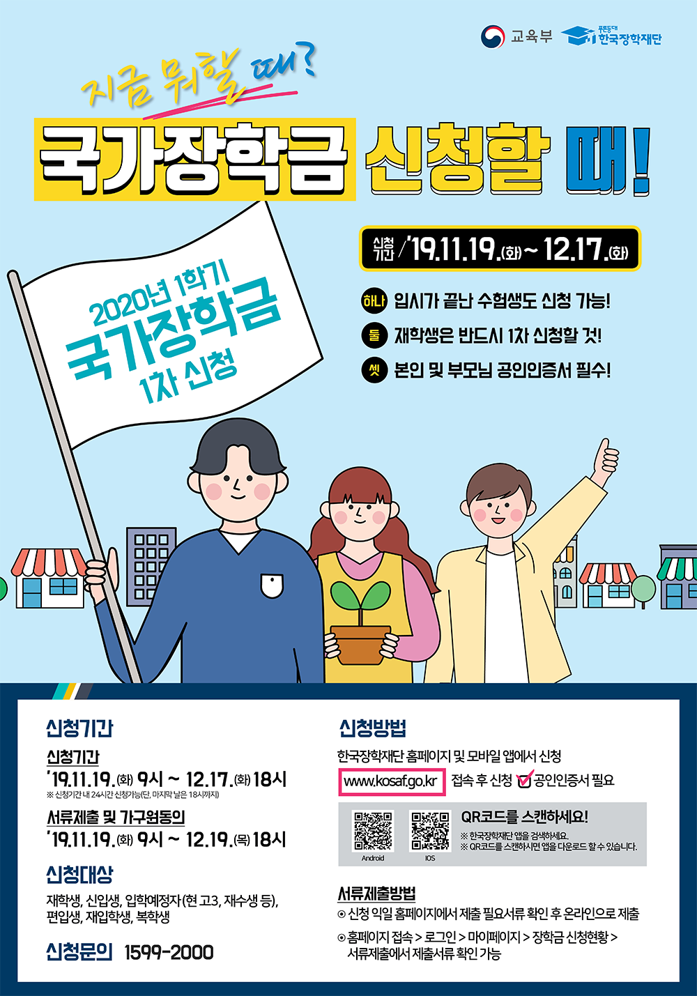 교육부와 한국장학재단은 11월 19(화)부터 12월 17일(화)까지 2020년 1학기 국가장학금 1차 신청을 접수 받는다고 밝혔습니다.