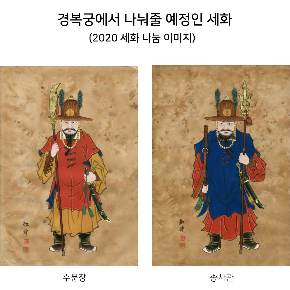 더불어 경복궁에서는 연휴 첫날인 1월 25일(음력 1.1.)에 새해를 기념하여 오후 2시 수문장 교대의식을 마친 후에 불화장(국가무형문화재 제118호) 전수교육조교가 그린 수문장과 종사관 그림을 나누는 ‘2020 세화(歲) 나눔’ 특별 행사를 진행됩니다. ‘세화’란 새해 첫날 세시풍속으로 경복궁을 지키는 수문장과 종사관을 그린 세화는 내 가족의 안녕을 지켜주는 행운의 부적과 같은 의미를 지녀 관람객들에게 뜻깊은 선물이 될 것입니다.