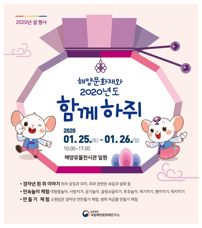 국립해양문화재연구소는 오는 25일부터 26일까지 해양유물전시관 야외광장과 라운지(휴게실)에서 ▲ 경자년 흰쥐 이야기, ▲ 민속놀이 체험, ▲ 만들기 체험 등 3가지 주제로 ‘해양문화재와 2020년도 함께 하쥐’ 행사를 펼칩니다.
