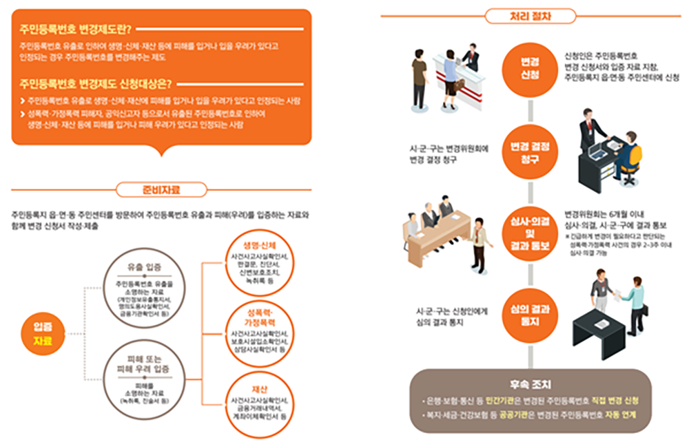 주민등록번호 변경제도는 주민등록번호 유출로 생명·신체, 재산 등의 피해를 입거나, 성폭력·가정폭력 피해자처럼 주민등록번호 유출로 피해를 입을 우려가 있는 사람의 경우 위원회의 심의·의결을 거쳐 주민등록번호 뒤 6자리를 변경해 줍니다.