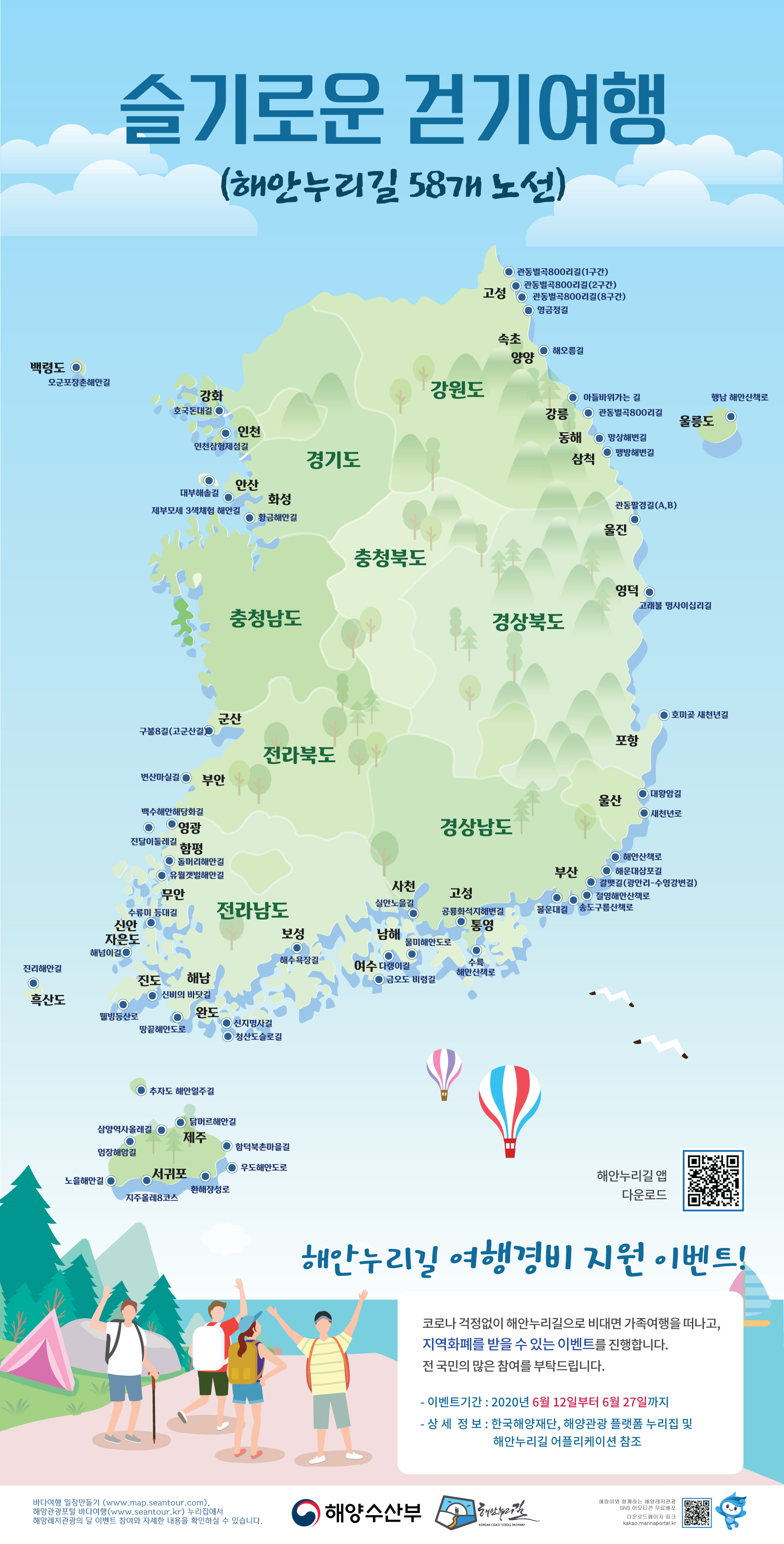 해양수산부와 한국해양재단은 해안누리길 여행을 희망하는 127개 가족을 추첨으로 선발, 희망하는 해안누리길 관할 지자체의 지역화폐로 한 가족당 여행경비 20만원을 지원합니다. 해안누리길 여행을 원하는 가족이라면 누구나 6월 12일 부터 6월 27일까지 해양관광누리집(www.oceantrip.or.kr)을 통해 신청 할 수 있습니다.