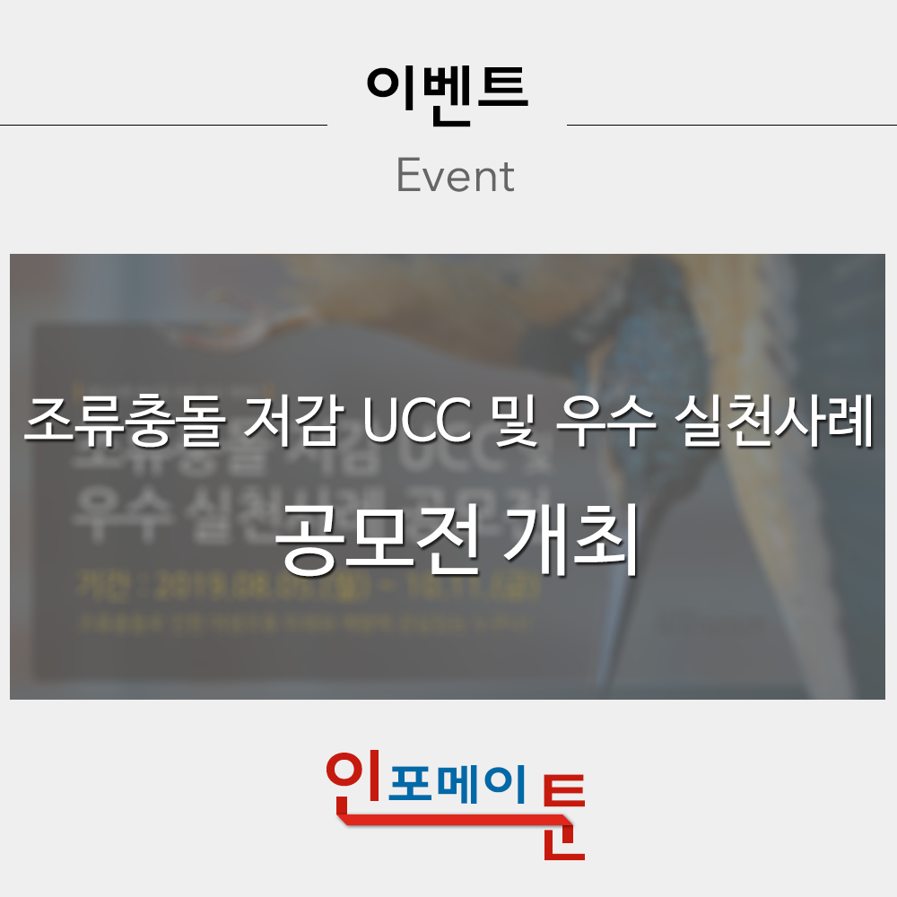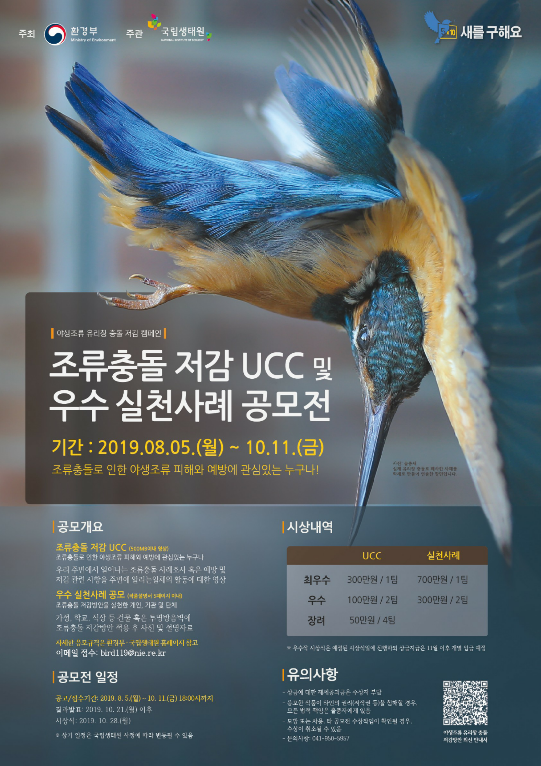 환경부와 국립생태원은 ‘조류 충돌 저감 손수제작물(UCC) 및 우수 실천사례 공모전’을 2019년 8월 5일부터 10월 11일까지 개최한다고 밝혔습니다.