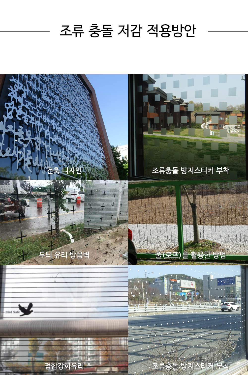 조류충돌 문제를 저감하는 원리로 불투명한 소재를 활용하거나, 투명한 소재를 쓰더라도 패턴, 불투명도, 색깔 등을 활용하여 조류가 통과하려 하지 않도록 설계하는 방법이 있습니다. 미국조류보전협회 등의 자료를 보면 대부분의 조류는 수직 간격 5㎝, 수평 간격 10㎝ 미만의 공간을 통과하려 하지 않는 특성이 있으므로, 무늬 간 간격 10㎝ 이하의 수직무늬, 무늬 간 간격 5㎝ 이하의 수평무늬, 그밖에 빈 공간 50㎠ 이내의 다양한 무늬를 활용할 수 있습니다.