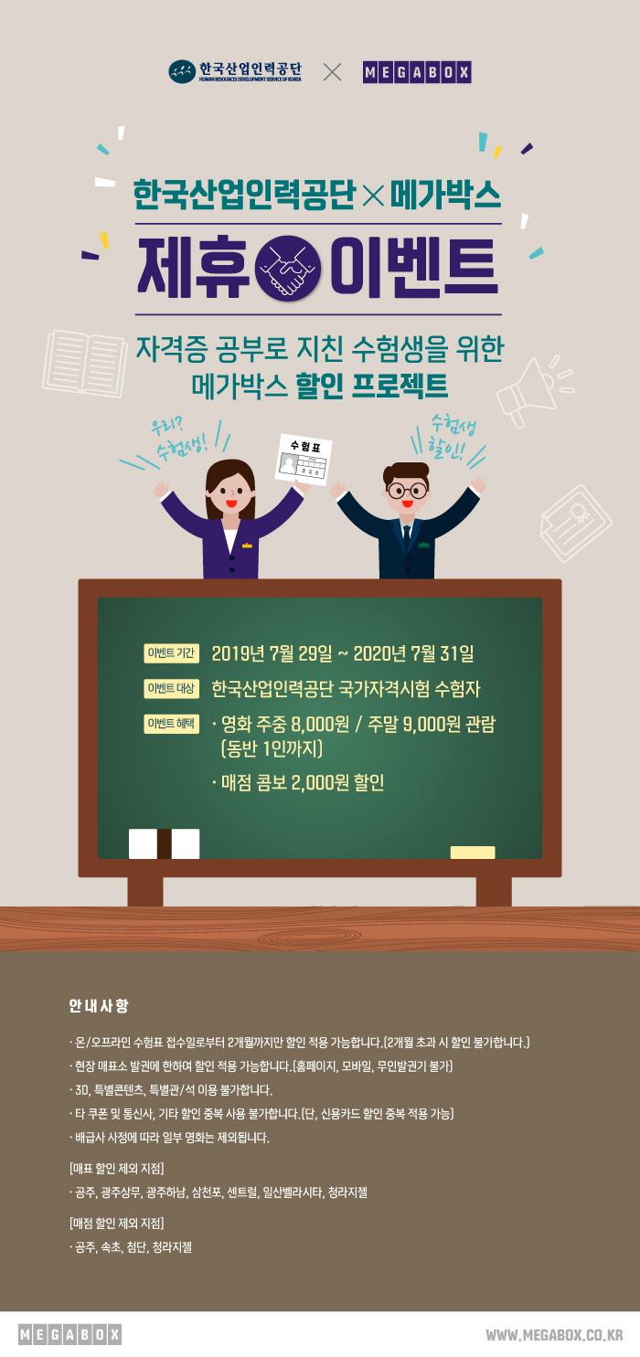 한국산업인력공단은 메가박스중앙(주)와 협약을 맺고 일부 지점을 제외* 한 전국 메가박스에서 공단이 시행하는 국가자격시험의 수험표를 제시하면 수험자 본인과 동반 1인에게 영화관람 및 매점상품 할인 혜택을 제공합니다.