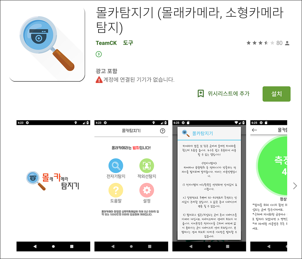 앱스토어에서 몰카탐지기를 검색하면 다양한 몰카탐지기 앱이 있습니다. 육안으로는 식별이 불가능한 곳에 설치된 몰래카메라를 식별하는데 도움이 됩니다. 대부분 스마트폰을 이용하여 전자기기가 방출하는 전자기를 탐지하거나, 필터화면을 통해 적외선을 감지하는 정도라고 보시면 됩니다. 앱 정보는 아래 링크를 참고하세요.