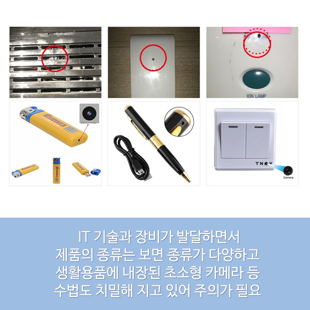 몰래카메라는 IT 기술과 장비가 발달하면서 생활용품에 내장된 초소형 카메라 등을 쉽게 구입하여 촬영이 가능합니다. 제품의 종류는 보면 종류가 다양하고 수법도 점점 치밀해 지고 있어서 각별한 주의가 필요하겠습니다. 문제는 이렇게 불법으로 촬영한 영상들이 온라인, 모바일 등을 통해 유포되어 2차 피해가 발생하는 것입니다.
