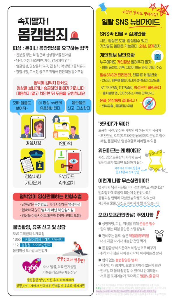 위의 그림은 몸캠범죄 관련하여 예방방법에 대해 정리하여 소개하고 있는 자료입니다. 돈이나 음란영상을 요구하며 협박하는 몸캠범죄도 최근 많이 발생하고 있는데요. 지능화된 몸캠피싱으로 불법촬영 영상을 유포하거나 유포하겠다는 협박으로 금전을 요구하는 것입니다. 몸캠 등의 노출을 자제하고 악성링크 클릭 등을 금지하는 것이 제일 중요하겠지만 몸캠범죄가 발생한 경우 협박에 따르지 않고 바로 신고하고 관련 기관의 도움과 지원을 요청하시기 바랍니다.