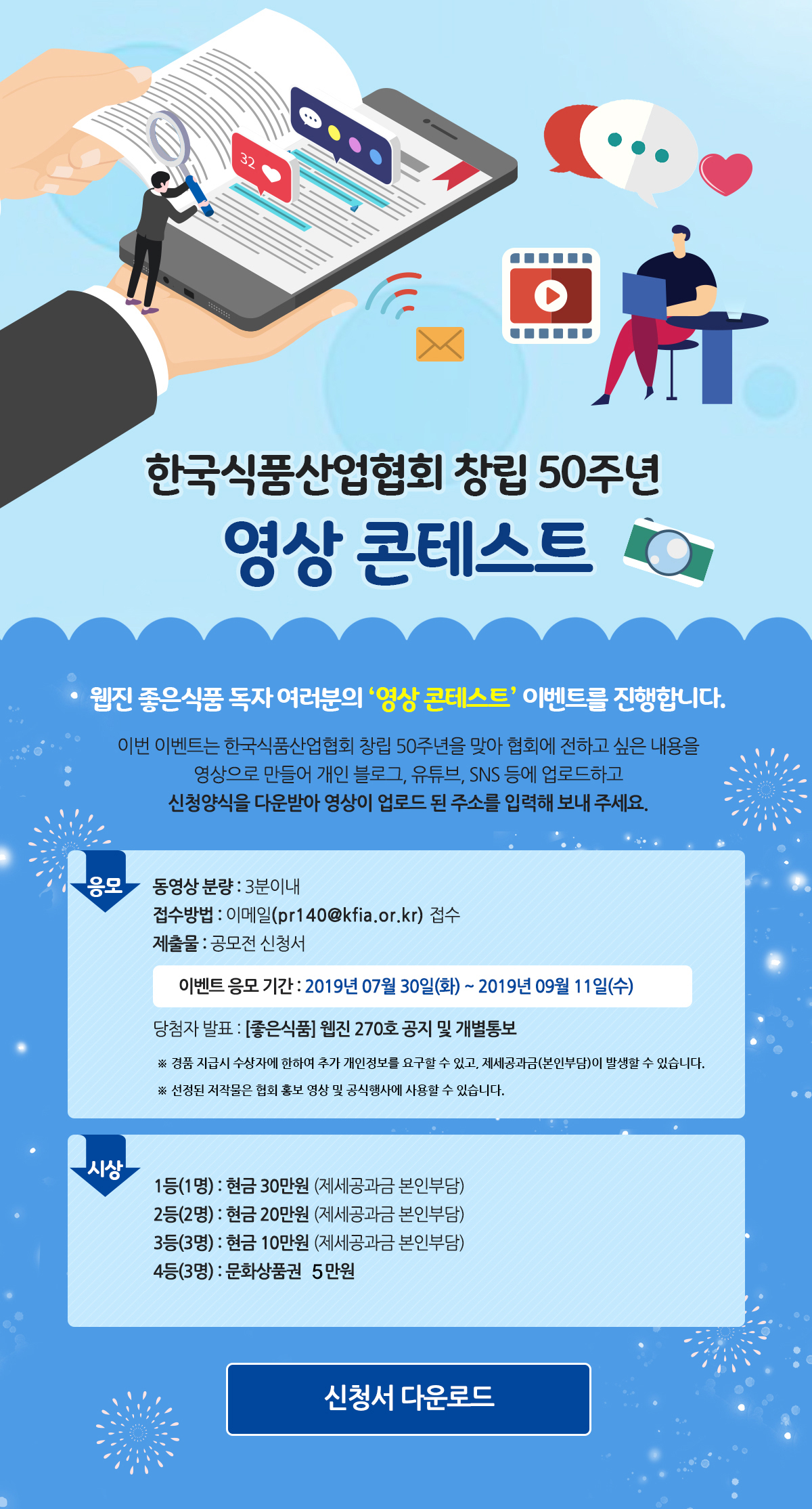 한국식품산업협회 웹진 <좋은 식품>이 창립 50주년 기념 영상 콘테스트를 개최한다고 밝혔습니다.