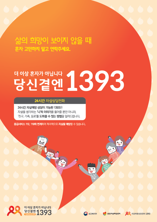 혼자 고민하지 말고 자살예방 상담전화 1393으로 전화하세요.