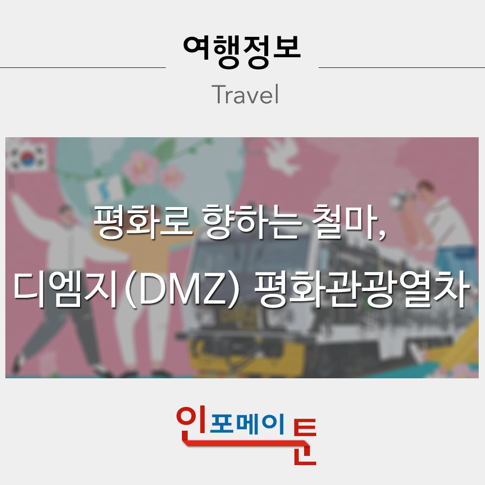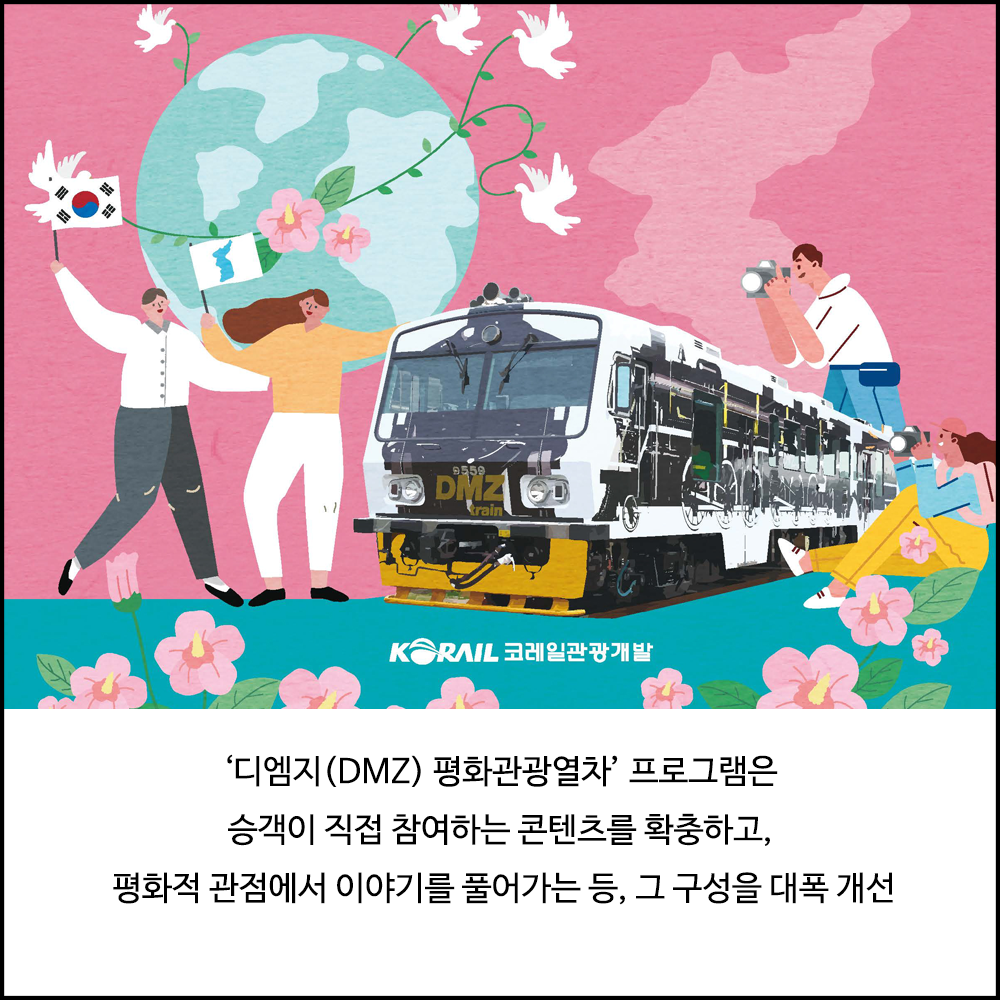 문화체육관광부(이하 문체부)는 한국관광공사(이하 관광공사), 코레일관광개발과 함께 기존에 운영하던 비무장지대(DMZ) 관광열차의 프로그램을 개선한 ‘디엠지(DMZ) 평화관광열차’ 프로그램을 개발했다고 밝혔습니다. 이번 프로그램은 시범운영 기간(2019년 8월 14일~31일)을 거쳐 2019년 9월 1일(일)부터 정식 상품으로 판매됩니다.