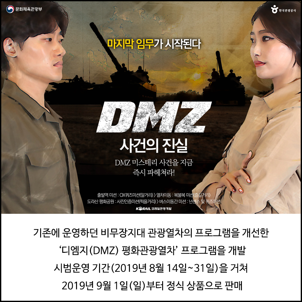 문화체육관광부(이하 문체부)는 한국관광공사(이하 관광공사), 코레일관광개발과 함께 기존에 운영하던 비무장지대(DMZ) 관광열차의 프로그램을 개선한 ‘디엠지(DMZ) 평화관광열차’ 프로그램을 개발했다고 밝혔습니다. 이번 프로그램은 시범운영 기간(2019년 8월 14일~31일)을 거쳐 2019년 9월 1일(일)부터 정식 상품으로 판매됩니다.