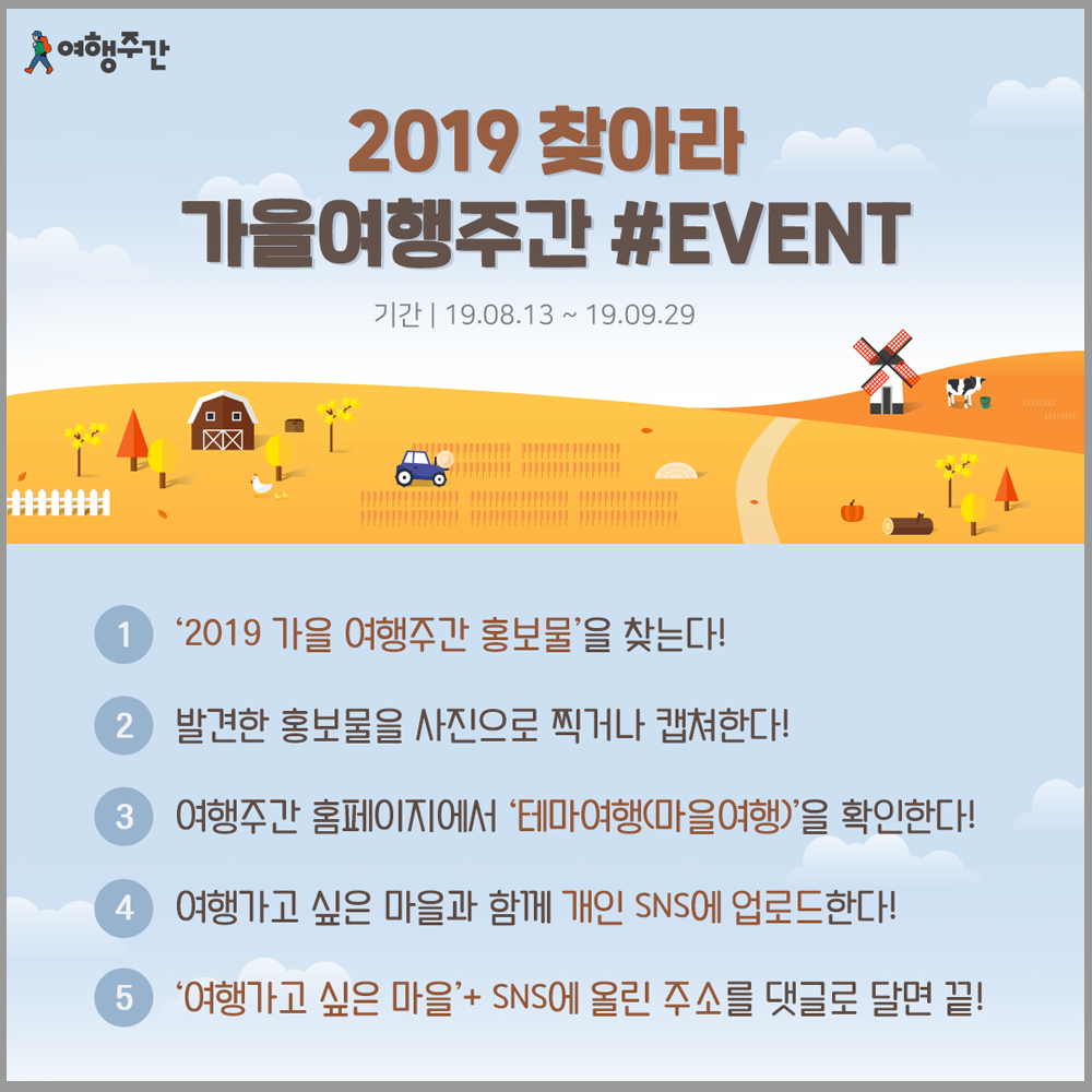 2019 가을 여행주간의 홍보물 찾고, 가을여행 필수품을 받을 수 있는 경품 이벤트입니다.
