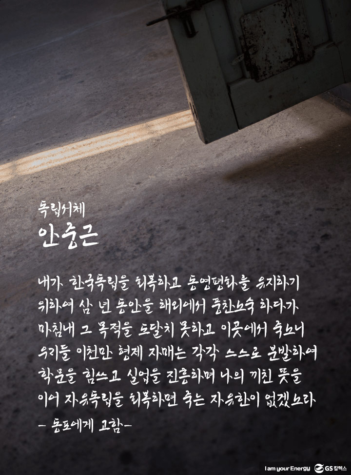 GS칼텍스는 이번 독립서체 3차 캠페인으로 광복절을 맞이하여, 동양 평화를 기원하며 순국한 영웅 안중근의 서체를 무료배포 합니다.