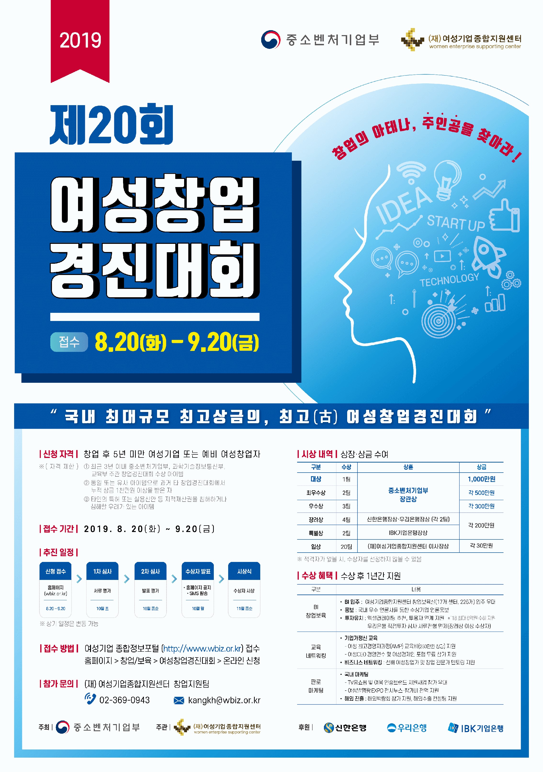 여성기업종합지원센터는 여성창업 활성화 및 우수 여성창업가 발굴·지원을 위해 ‘창업의 아테나, 주인공을 찾아라’ 제20회 여성창업경진대회를 개최한다고 밝혔습니다.