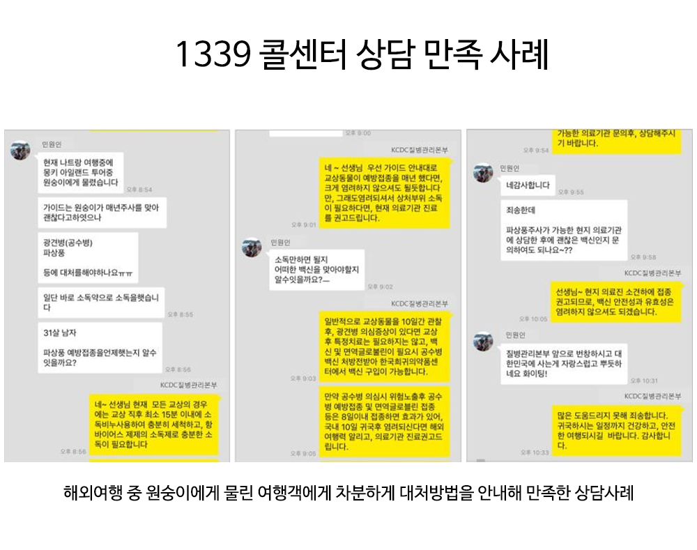 특히, 최근에는 해외여행 중 원숭이에게 물린 여행객에게 차분하게 대처방법을 안내해 만족한 사례, 해외 거주 중인 국민이 자녀 예방접종 문의 시 친절한 안내에 감동받았다는 맘카페 게시글 등 상담서비스 관련 각종 상담만족 사례가 있습니다.
