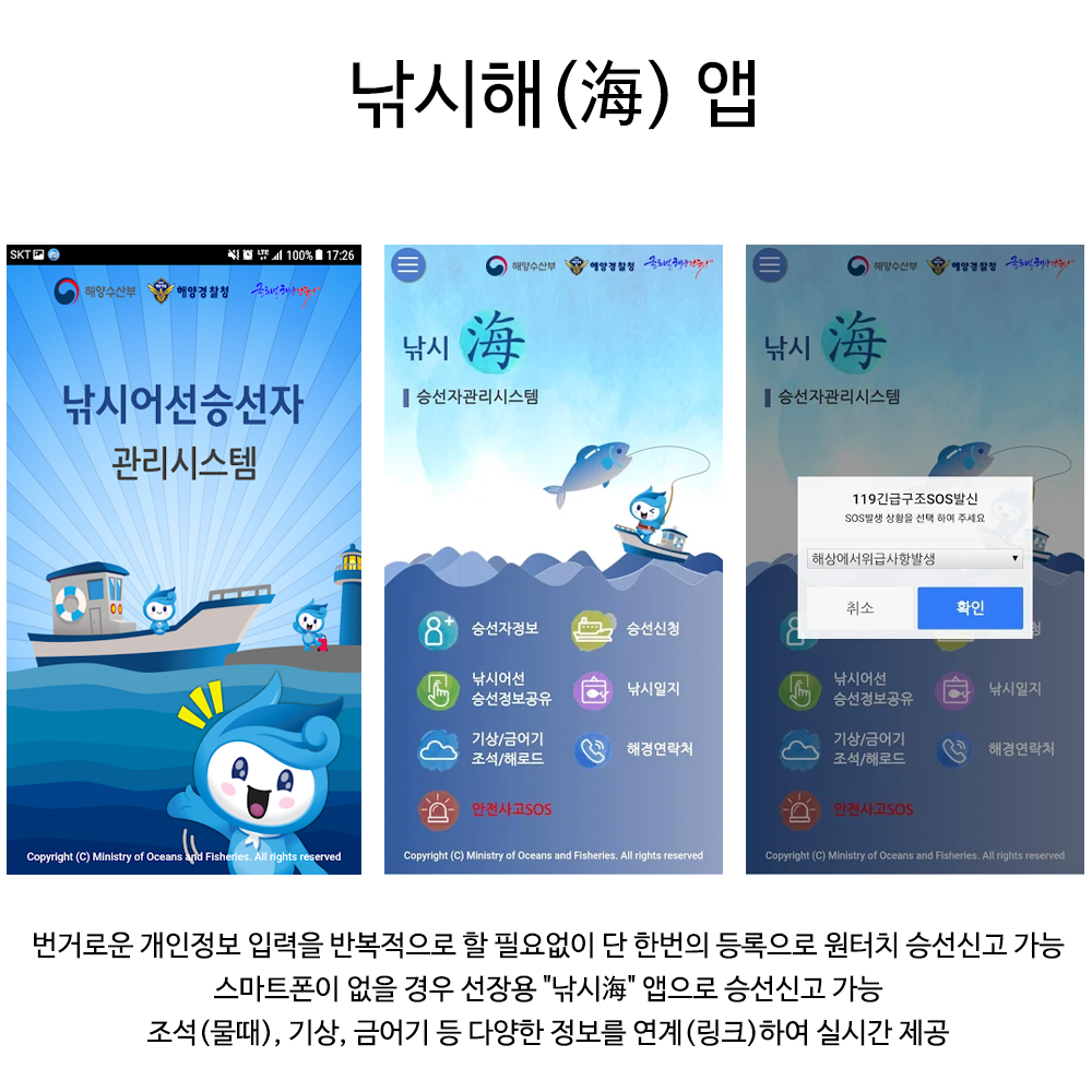 ‘낚시해(海)’ 앱은 대국민용, 선장용, 해경용으로 구성되어 있으며, 안드로이드 폰과 아이폰 모두 이용이 가능합니다. 이용을 원하는 경우 9월 1일부터 구글 플레이스토어와 9월 10일부터 애플 스토어에서 ‘낚시해’를 검색하여 무료로 내려 받아 사용할 수 있습니다.