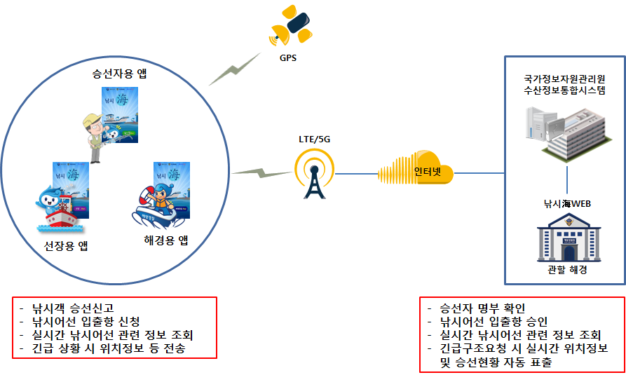 아울러, 해상에서 긴급상황이 발생할 경우 승선자나 선장이 ‘낚시해(海)’ 앱으로 ‘긴급구조’ 신고를 하면 소방청(긴급구조표준시스템)에 위치정보(GPS)와 승선자 현황 등이 실시간 전송되고, 해당 낚시어선의 출입항을 관할하는 해경파출소에 구조를 요청하여 더욱 신속한 구조가 가능해질 전망입니다.