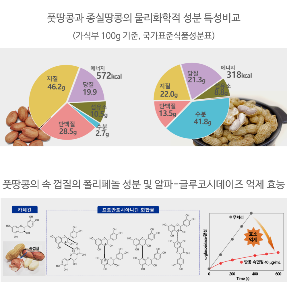 풋땅콩은 속껍질도 함께 먹습니다. 속껍질에는 항산화 효과가 있는 카테킨, 프로안토시아닌류의 폴리페놀이 많이 들어 있습니다. 땅콩 속껍질은 혈당을 높이는 알파-글루코시데이즈 효소 억제 효과도 있습니다. 탄수화물 흡수를 늦춰 식후 혈당 조절에 도움을 줍니다. 풋땅콩 100g에는 약 150mg의 폴리페놀이 들어 있습니다. 폴리페놀 성분이 많은 품종으로는 ‘다안’, ‘신팔광’, ‘케이올’ 등이 있습니다.
