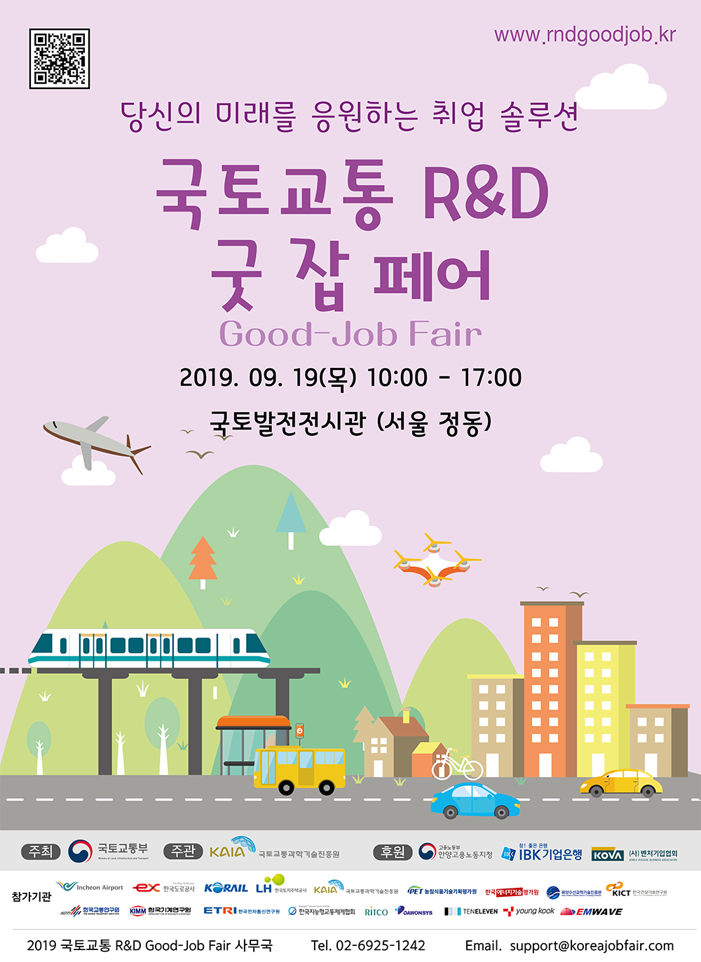 2019년 9월 19일(목)에는 국토교통 연구·개발 분야의 일자리 정보를 제공하는 ‘국토교통 연구개발(R&D) 좋은 일자리 박람회(Good-Job Fair, www.rndgoodjob.kr)’를 국토발전전시관(서울 중구 정동길 18)에서 개최합니다.