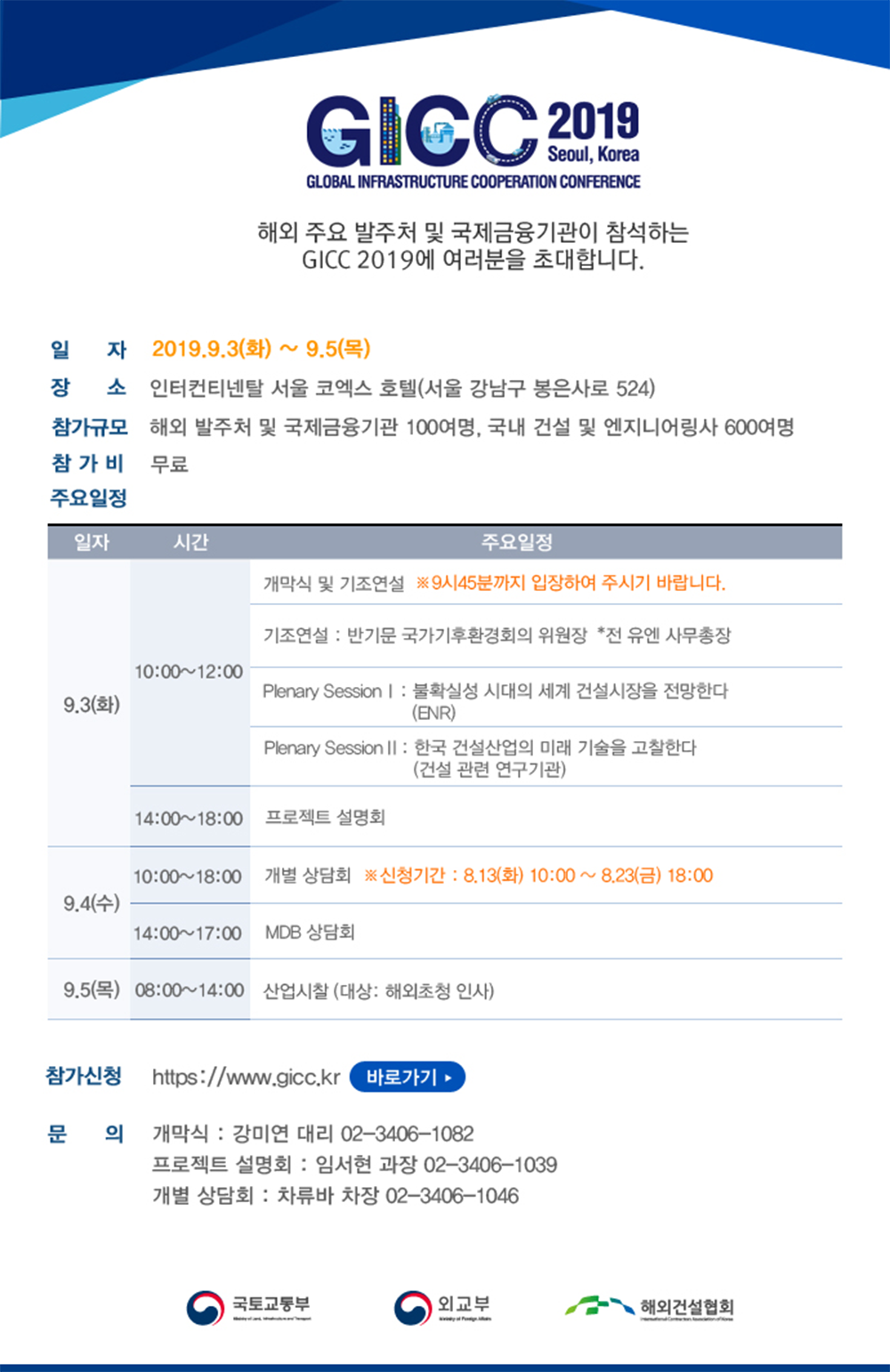 취업박람회 외에도, 2019년 9월 3일(화)부터 5일(목)까지 3일 동안 서울 인터콘티넨탈 호텔(코엑스)에서 개최되는 「2019 글로벌 인프라협력 콘퍼런스(GICC, www.gicc.kr)」를 통해 주요 발주처 인사 초청, 고위급 면담, 해외 발주처 프로젝트 설명회, 해외 발주처와 우리기업 간 1:1 면담 등 해외건설 시장 수주 회복과 관련 일자리 창출을 적극 지원할 예정입니다.