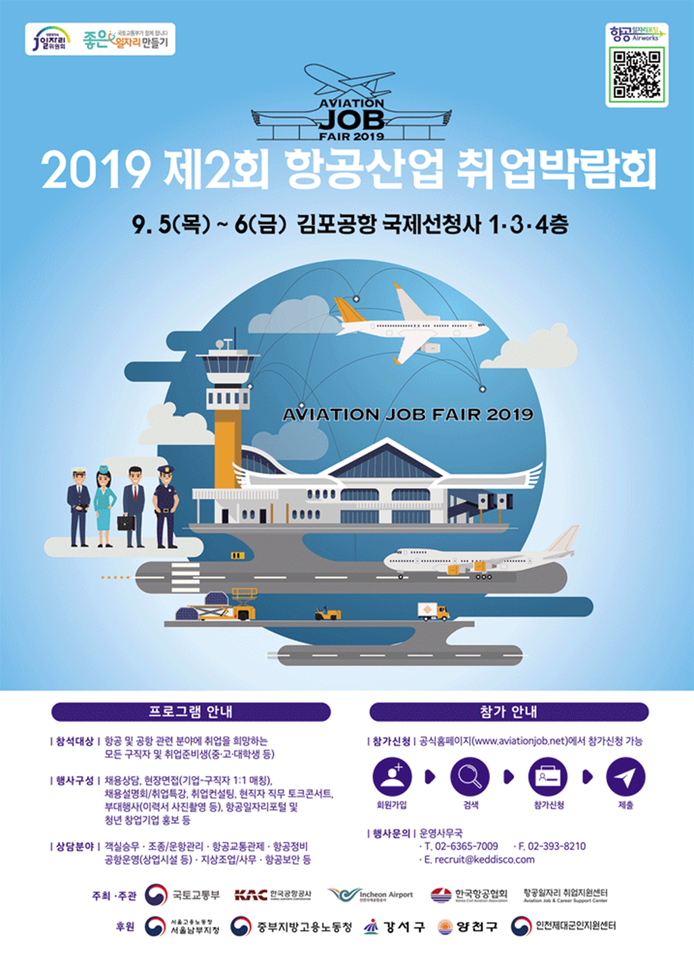 먼저, 9월 5일(목)부터 6일(금)까지 이틀 간 「제2회 항공산업 취업박람회(www.aviationjob.net)」가 김포공항 국제선(1·3·4층)에서 개최됩니다.