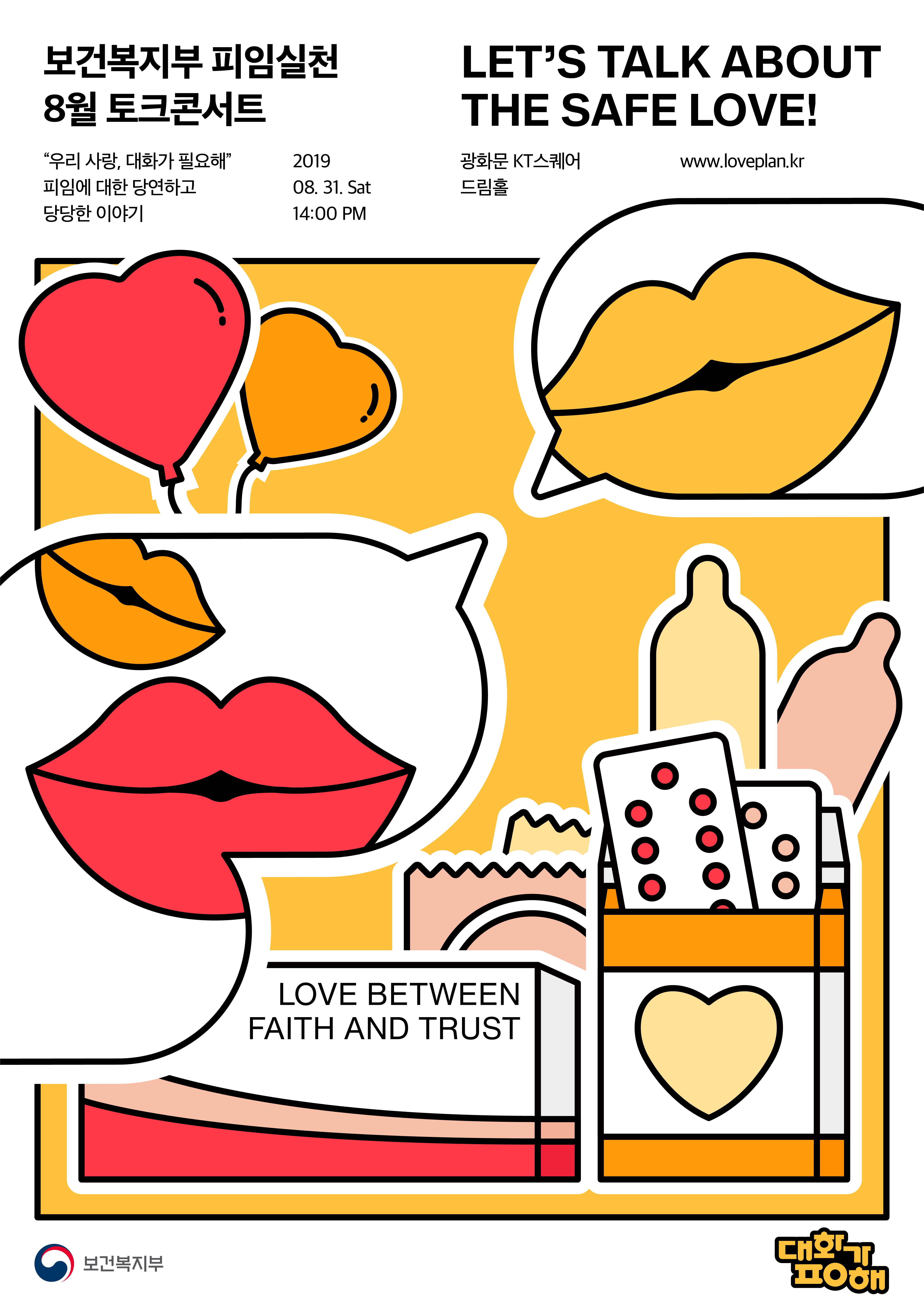 보건복지부가 주최하는 피임실천 릴레이 토크콘서트 ‘대화가 ㅍㅇ해’가 2019년 8월 31일(토) 광화문 KT스퀘어 드림홀에서 오후 2시부터 열립니다.