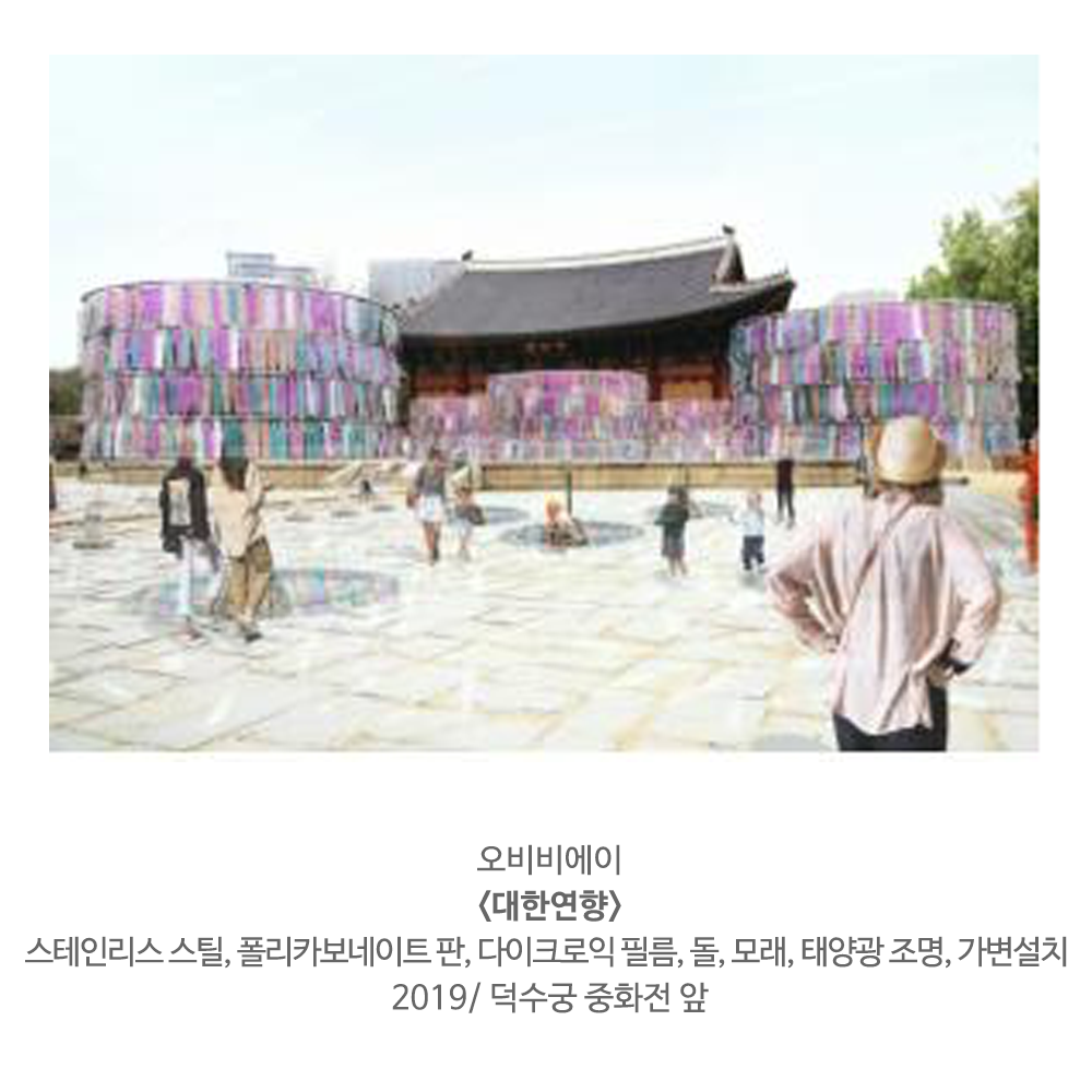 덕수궁은 과거와 현재, 그리고 동서양이 충돌하는 장소적 특징을 가지고 있다. 산자락 아래 터를 잡은 다른 궁과 달리 도심 한복판 빌딩 숲 사이에 자리한 덕수궁 안에는 전통 목조건축과 서양식 석조 건축이 공존한다. 1902년 중화전 앞마당에서 대한제국의 마지막 전통 연회가 열렸다. <고종임인진연도8폭병풍>에 기록되기도 한 이 연향으로 황실의 권위를 세우고자 했던 고종의 의지를 추측할 수 있다. 이와 같은 국가의 주요 의례를 치렀던 상징적 공간인 중화전 앞마당에서 오색 반사필름으로 시시각각 바람에 반응하는 이 작품은 빛을 산란시키고, 춤추듯 화려한 색의 그림자를 바닥에 드리운다. 작품은 또 다른 충돌을 위한 매개체로써, 빛과 바람의 충돌을 통해 반사와 투과를 끊임없이 반복하며 새로운 풍경을 자아낸다. 건축가들은 연향에 사용되었던 가리개인 만인산, 천인산 등 공간을 새로이 창출했던 ‘변화 가능성’의 장치들에 주목하며, 이러한 전통 임시 구조물에서 영감을 얻은 작품으로 오늘날 요구되는 유연한 사고, 가치, 공간에 관한 암시를 한다.