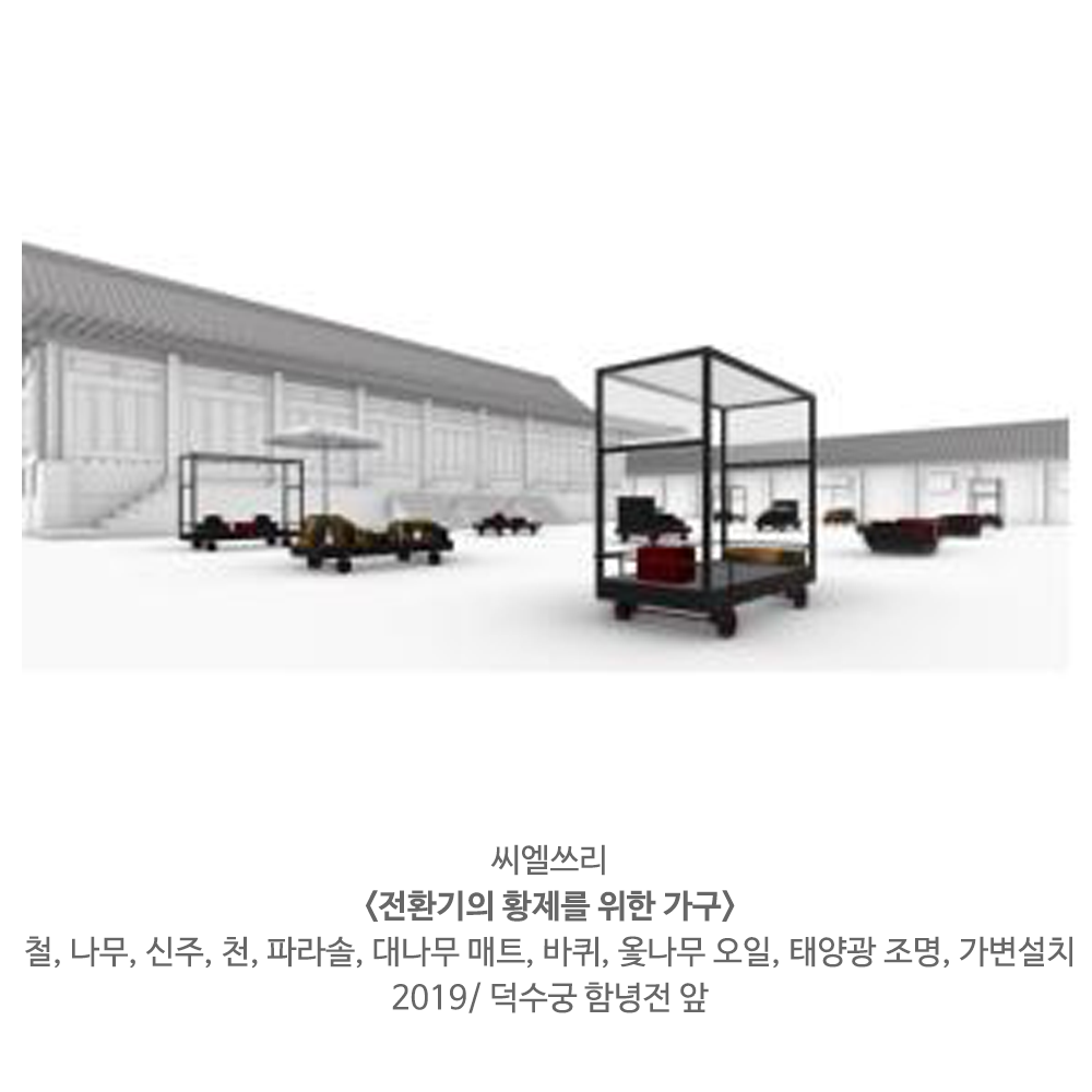 황제의 침전으로 주로 쓰였던 함녕전은 고위 관원들과 모여 국정을 논의하는 곳으로 쓰이기도 했다. 대한제국 시기 고종은 왕에서 황제로, 나라 안을 향한 사고는 서구를 향한 개방으로 중첩과 전환이 일어난 점에 주목한 건축가는 건축적으로 건물과 건물 사이의 전환 공간인 안뜰에 흥미를 가졌다. 전환기의 황제를 위해 디자인한 바퀴 달린 가구를 통해 이동성과 변위, 융통성 개념을 탐구한다. 황실의 가마와 가구에서 영감을 받은 건축가는 샤를로트 페리앙의 라운지 의자 등 서구에서 실험되었던 가구의 형태를 조합한 6개의 유형을 만들었고, 관람객은 가구에 직접 앉아보며 동서양이 만나던 대한제국기의 과도기적 모습을 상상할 수 있다.