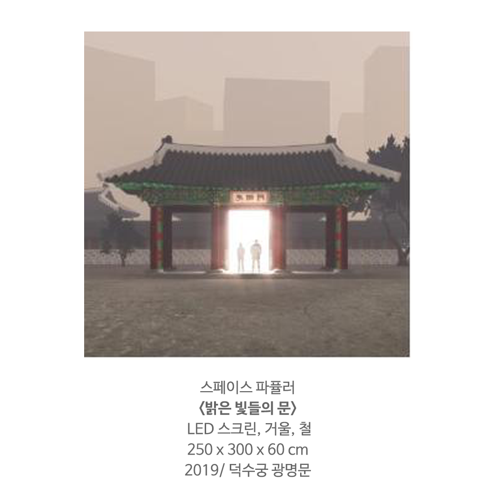 광명문의 중앙 출입구를 액자 삼은 밝은 전자 빛의 문을 통해 가상의 공간으로 우리를 인도하는 이 작품은 디지털 스크린의 시대 속 건축의 변화하는 역할에 대해 질문한다. 아름다운 석재와 정교한 기둥, 화려한 처마 등으로 대표되는 왕궁의 건축은 공명정대한 통치라는 이상을 사람들에게 전달하는 매체의 기능을 했다. 일제 점령기 덕수궁이 그 지위를 잃을 무렵, 건축은 국제주의의 현대식 건물로 더 이상 장식적 의사소통을 하지 않게 되었다. 매체는 이제 지배자와 피지배자 사이의 인터페이스가 아니며, 신문, 라디오, 텔레비전에 거쳐 오늘날 주머니에 들어오는 크기가 되어 이를 통해 저마다 자신의 궁에서 지배자 노릇을 한다. 그 궁의 문은 하나로 연결된 디지털 세상의 플랫폼과 인터페이스이며, 대중에게 열려있다. 작품은 픽셀로 장식된 우리 시대의 ‘밝은 빛들의 문’을 통해 새로운 궁으로 들어서는 길을 열고 있다.